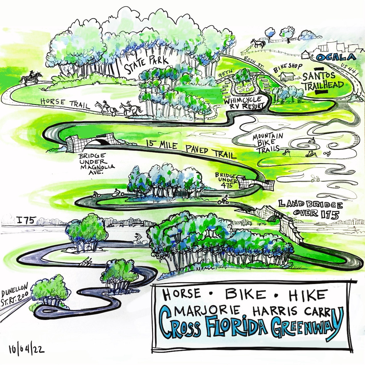 If you’re looking for the equestrian trails, you’ll find a day-use equestrian staging area located just west of U.S. 441 and at the Santos Trailhead. The trailhead provides access to the Cross Florida Greenway equestrian trails that run clear over to the Pruitt Trailhead near Dunnellon. It’s a truly extensive equestrian system made up of over 60 miles of horse trails with a variety of difficulty levels and even wagon and carriage opportunities.